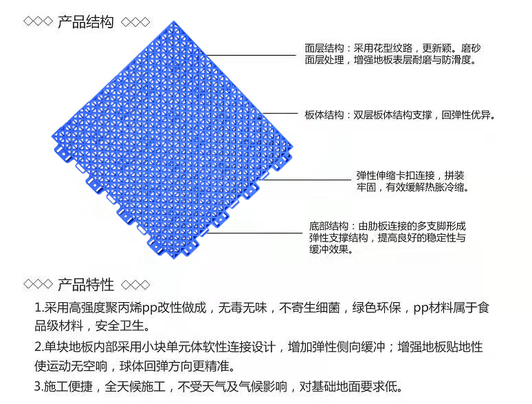 面層采用花型紋路,磨砂面層處理,增加地板表層耐磨和防滑度。板體結(jié)構(gòu),雙層板體結(jié)構(gòu),回彈優(yōu)異。底部結(jié)構(gòu),由肋板連接的多支腳形成彈性支撐結(jié)構(gòu),提高良好的穩(wěn)定性和緩沖效果。