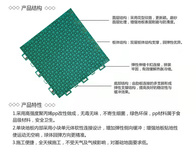 面層采用花型紋路,磨砂面層處理,增加地板表層耐磨和防滑度。板體結構,雙層板體結構,回彈優(yōu)異。底部結構,由肋板連接的多支腳形成彈性支撐結構,提高良好的穩(wěn)定性和緩沖效果。